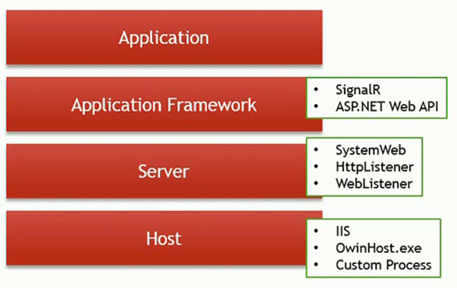 OWIN is Open Web Interface for .NET. It is a specification around this hosting abstraction. The primary interface in OWIN is called the application delegate. The main goal of Katana is portability and it is achieved by reducing the abstraction with as few primitives as possible.OWIN application is made up of four logical layers