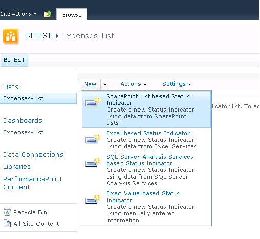 Create a Status List in the Business Intelligence Center site in SharePoint. You can add status indicator once you create a list. Steps to create a list